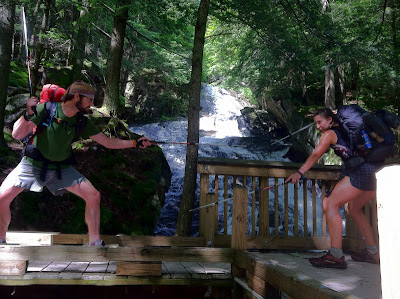 7/2/11 Things are really moving for Pace and Porter. After a visit back home and being dropped off in Bennington, VT, Dreamer drove half-way to Manchester and got on the trail to hike in 6.5 miles to meet Porter and Pace. (Don't tell, but Dreamer went the wrong way for about a half-hour until she saw some hikers and asked which way was south.) Meanwhile Porter, Pace, Deva, and Mike St. Pierre of Hyperlite Mountain Gear, hiked 20 miles to Kid Gore Shelter, mile 1,615.7, elevation 2,795 feet.